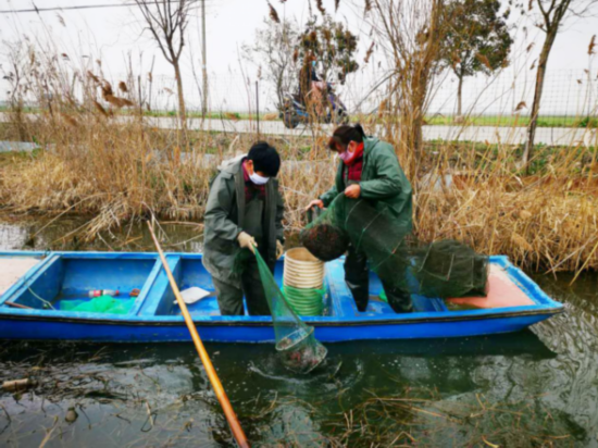 初春时节,阜宁县郭墅镇孙灶村藕虾套养基地的小龙虾喜获丰收。“从2月22日,我们捕捞龙虾,一直到5月底结束。现在捞上来的成品虾是去年5月份留下的苗虾长成的。”基地负责人孙爱华介绍说。
