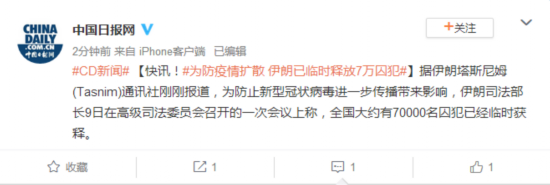 据伊朗塔斯尼姆(Tasnim)通讯社刚刚报道,为防止新型冠状病毒进一步传播带来影响,伊朗司法部长9日在高级司法委员会召开的一次会议上称,全国大约有70000名囚犯已经临时获释。