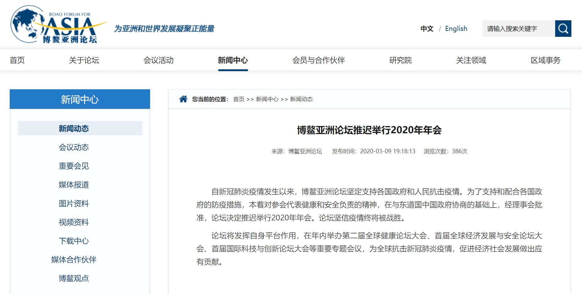 自新冠肺炎疫情发生以来,博鳌亚洲论坛坚定支持各国政府和人民抗击疫情。为了支持和配合各国政府的防疫措施,本着对参会代表健康和安全负责的精神,在与东道国中国政府协商的基础上,经理事会批准,论坛决定推迟举行2020年年会。论坛坚信疫情终将被战胜。