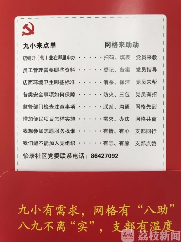 店铺复工如何申请?员工需要准备哪些材料?各类安全事项怎么保障……在推进辖区“九小”复工复业的过程中,一系列现实问题接踵而至,困扰着亟待复工的“九小”负责人,也给日夜忙碌的社区工作者又添了一桩心事。怡康社区党委书记夏安雅认为,“九小”行业确实存在先天不足的劣势,但作为现代城市文明建设中不可或缺的组成部分,它们同样需要得到一份周全,“在‘温情菜单’中,店铺开营业、员工管理、店面环境卫生、安全事项等全都在列,只要他们点单,我们就来助力。”