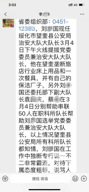 举报帖称,2020年3月4日,望奎县组织部门到县公安局考察干部,说要破格提拔刘某国为局党委委员。赵某表示:“我做为主管领导,想知道刘彦国在疫情防控期间究竟做了哪些工作?”