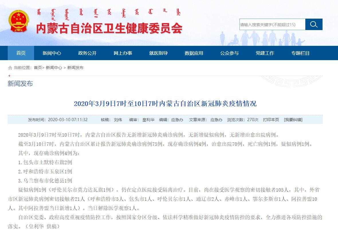 截至3月10日7时,内蒙古自治区累计报告新冠肺炎确诊病例75例,现存确诊病例4例,治愈出院70例,死亡病例1例,疑似病例1例。