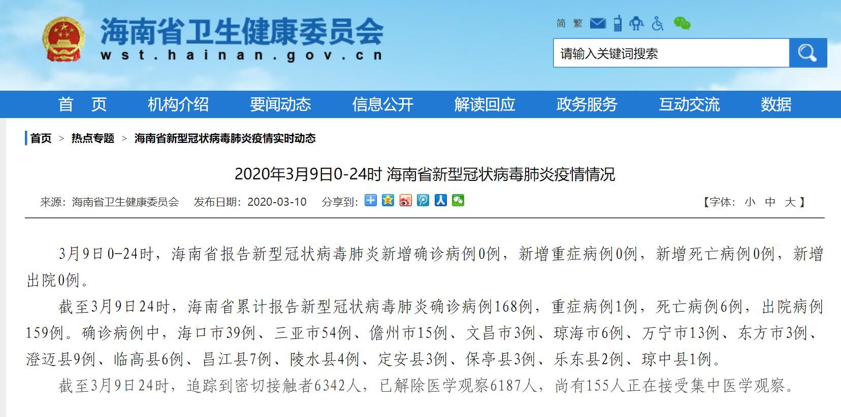 截至3月9日24时,海南省累计报告新型冠状病毒肺炎确诊病例168例,重症病例1例,死亡病例6例,出院病例159例。确诊病例中,海口市39例、三亚市54例、儋州市15例、文昌市3例、琼海市6例、万宁市13例、东方市3例、澄迈县9例、临高县6例、昌江县7例、陵水县4例、定安县3例、保亭县3例、乐东县2例、琼中县1例。