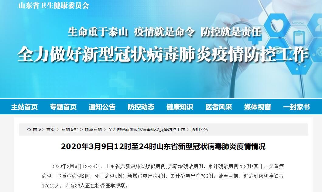 荔枝新闻讯 据山东卫健委官网消息,2020年3月9日12-24时,山东省无新冠肺炎疑似病例;无新增确诊病例,累计确诊病例758例(其中,无重症病例,危重症病例2例,死亡病例6例);新增治愈出院4例,累计治愈出院703例。截至目前,追踪到密切接触者17013人,尚有86人正在接受医学观察。
