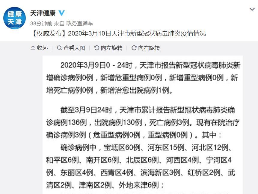 截至3月9日24时,天津市累计报告新型冠状病毒肺炎确诊病例136例,出院病例130例,死亡病例3例。现有在院治疗确诊病例3例(危重型病例0例,重型病例0例)。其中: