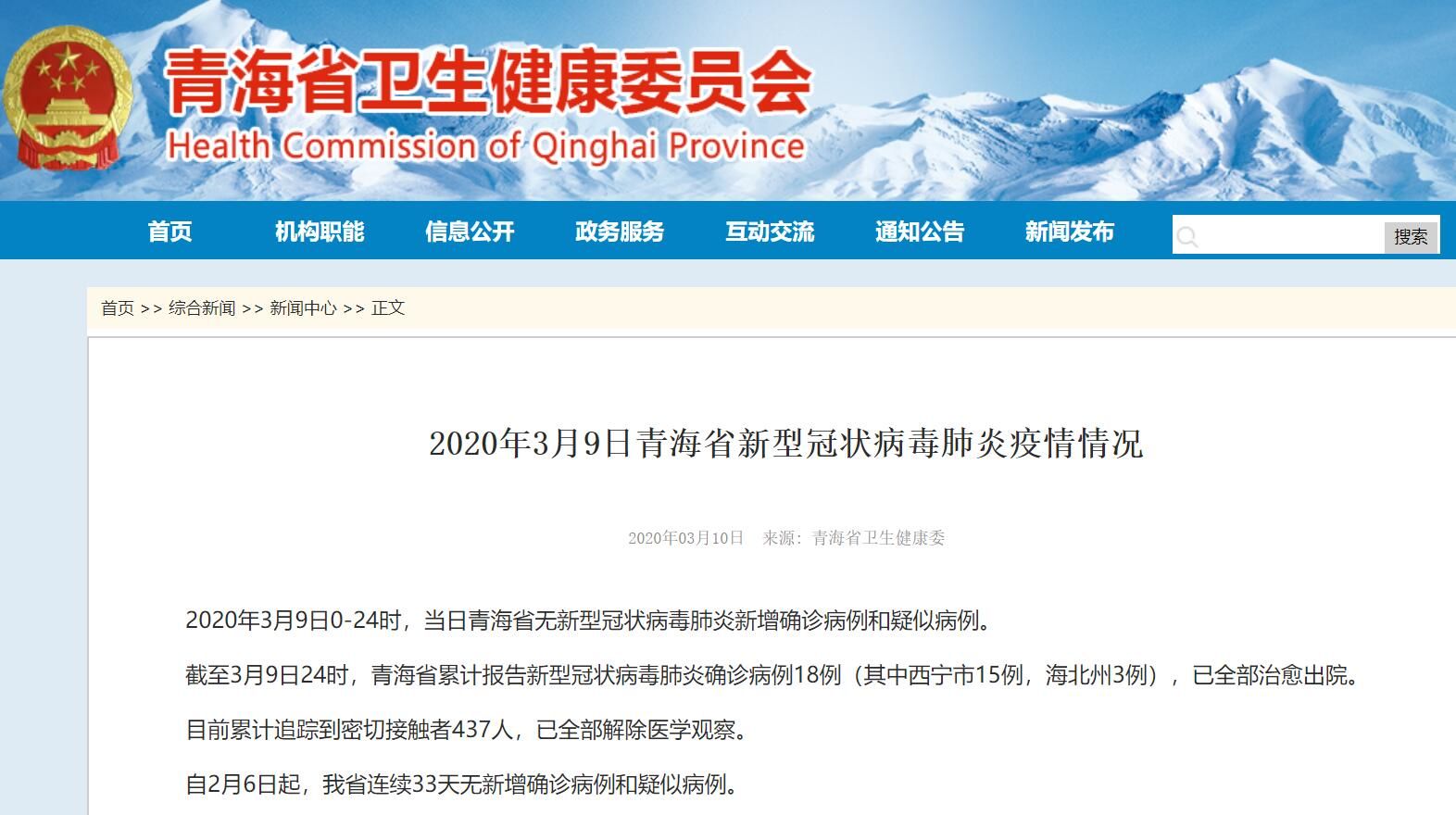 截至3月9日24时,青海省累计报告新型冠状病毒肺炎确诊病例18例(其中西宁市15例,海北州3例),已全部治愈出院。