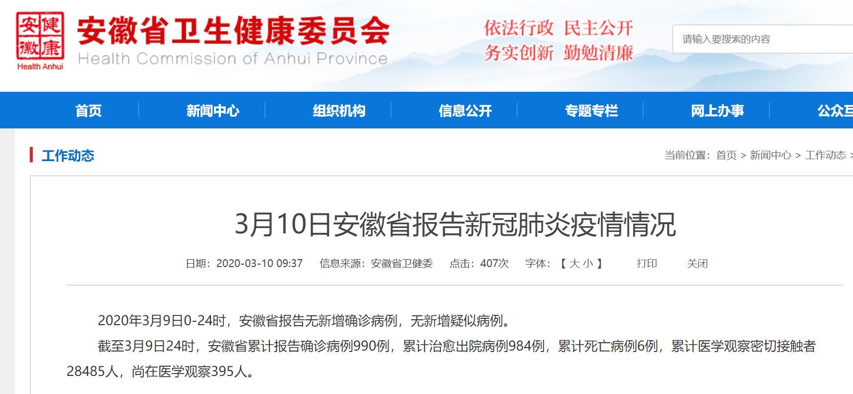截至3月9日24时,安徽省累计报告确诊病例990例,累计治愈出院病例984例,累计死亡病例6例,累计医学观察密切接触者28485人,尚在医学观察395人。
