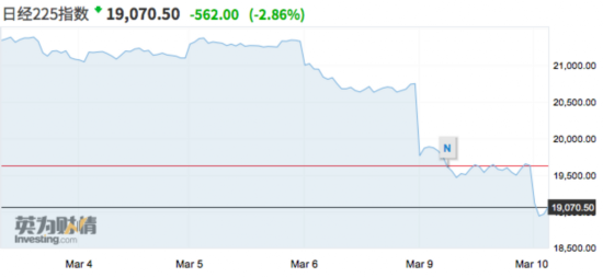 日经225指数开盘下跌1.1%,报19,474.89,开盘半小时后跌幅已经扩大至2.8%左右,周一该指数收跌5.07%。