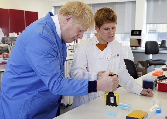 3月6日,在英国贝德福德,英国首相鲍里斯·约翰逊(左)访问一处医疗科研机构。新华社 图