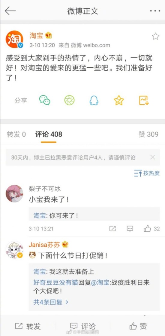对此,淘宝回应称,“感受到大家剁手的热情了,内心不崩,一切就好!对淘宝的爱来的更猛一些吧。我们准备好了!”