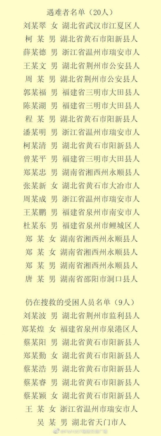 3月7日19时许,泉州欣佳酒店发生楼体坍塌事故,受困人员71人。经紧张搜救,截至3月10日16时38分,已搜救出62人(其中42人受伤、20人遇难),目前仍有9人受困。我们对事故遇难者表示沉痛悼念,向事故受伤人员和伤亡人员家属表示诚挚慰问。我们还在全力搜救失联者,只要有一丝希望就作出百倍努力。现将遇难者和仍在搜救的受困人员名单公布如下:
