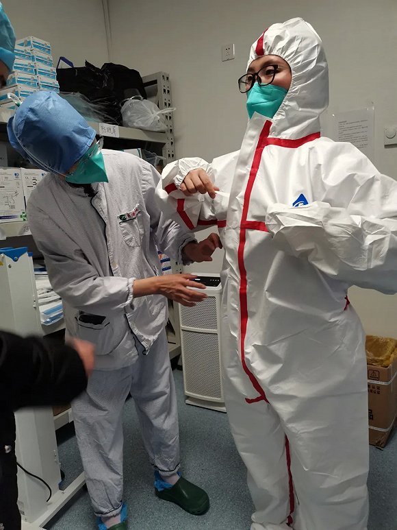 在医疗组、护理组出入病房时,都有感控组的值班人员陪同督导,他们逐项查验队员们穿戴/脱去防护用品的操作,确认合格后再出入。