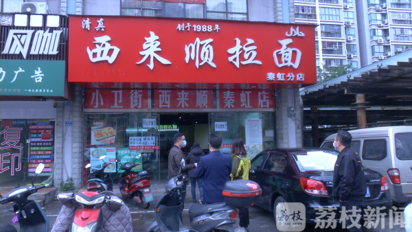 随后,记者又来到位于南京秦虹路一家西北风味的拉面馆,昨天这家店通过了验收,今天第一天恢复堂食。在入店的时候,有标识引导顾客保持1米5的距离进行排队,进入店之后,第一步要做的就是测量体温。