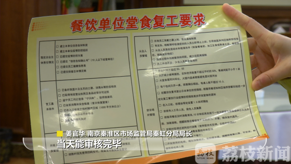 南京秦淮区市场监管局秦虹分局局长姜官华表示,餐饮单位不管大小,基本的场所条件和人员必备的要求都是一样的。“谁先申请的,我们就先到谁家检查,符合一家就开放一家餐饮店堂食,不符合的就责令整改,什么时候改的符合条件了、符合要求了,我们就允许它开放堂食。现在我们基本上能做到当天申请,当天能审核完毕。”
