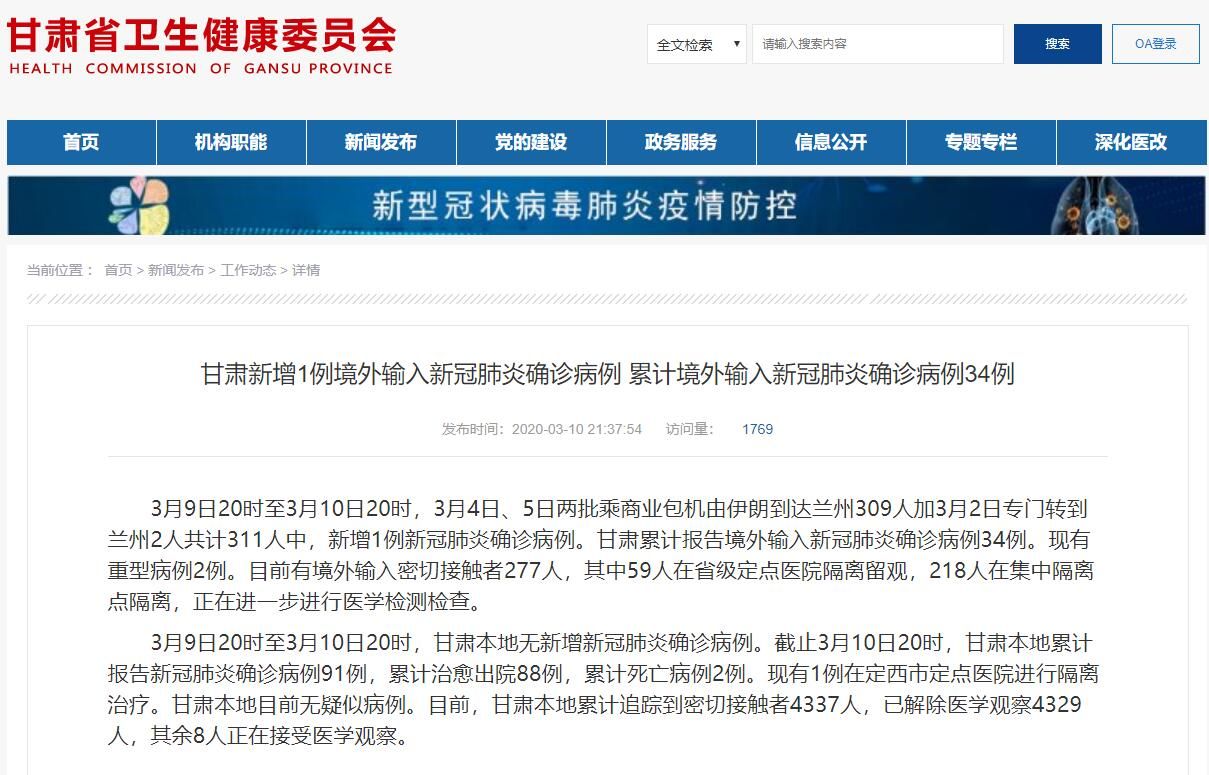 3月9日20时至3月10日20时,甘肃本地无新增新冠肺炎确诊病例。截止3月10日20时,甘肃本地累计报告新冠肺炎确诊病例91例,累计治愈出院88例,累计死亡病例2例。现有1例在定西市定点医院进行隔离治疗。甘肃本地目前无疑似病例。目前,甘肃本地累计追踪到密切接触者4337人,已解除医学观察4329人,其余8人正在接受医学观察。