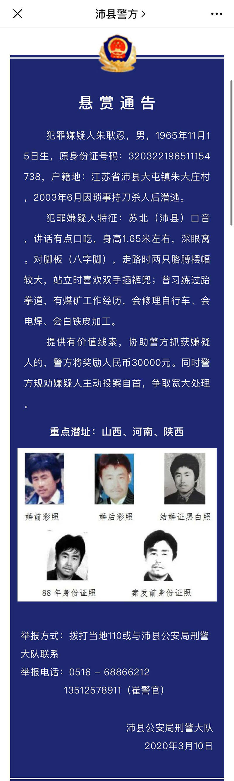 3月10日,江苏沛县警方发布一则“悬赏通告”,寻找17年前杀人后潜逃的犯罪嫌疑人朱耿忍。