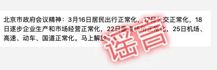 近日,两条谣言在多个微信群和朋友圈流传。一条声称“北京市政府会议精神,3月16日居民出行正常化,17日公交正常化......”,还有一条称“北京本月24日(两周后)开始,结束全市一级响应及轮班居家办公模式,有序全面复工……”