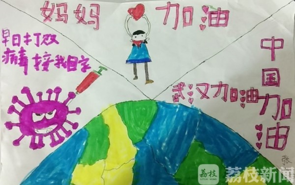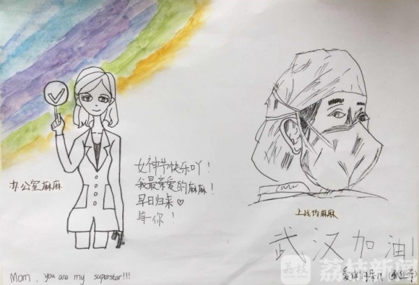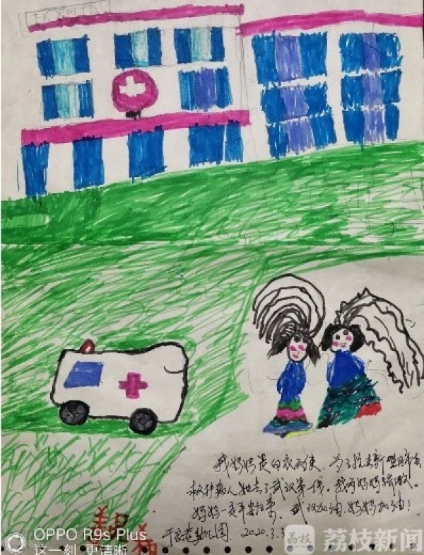 “妈妈,你去武汉救治病人,我画了一幅画,上面有医院,还有救护车,还有你和我,我和爷爷、奶奶、爸爸等着你平安归来。”