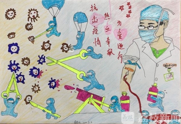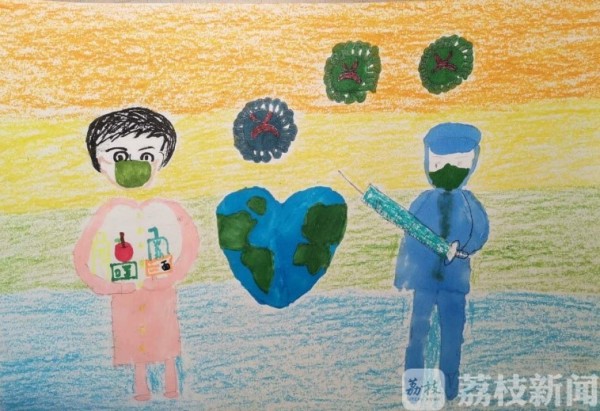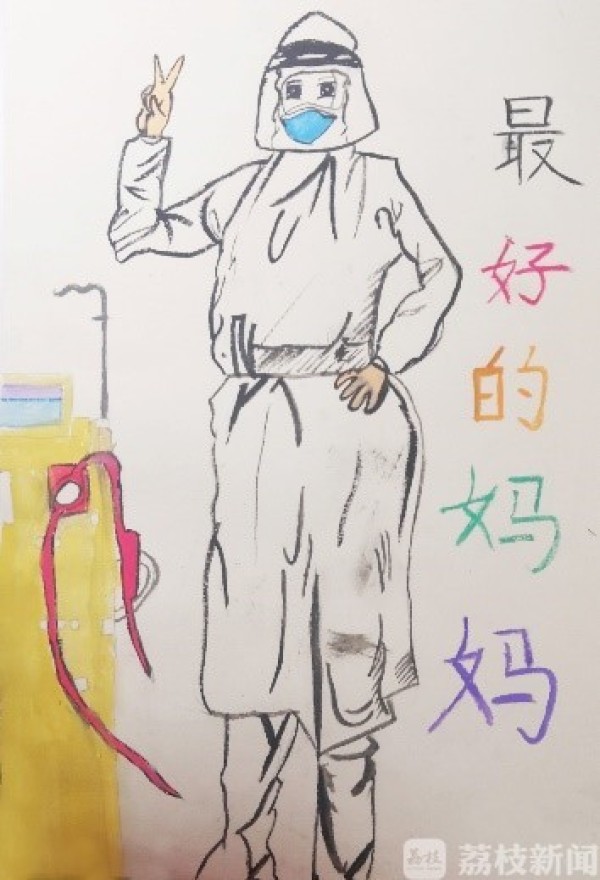 “疫情期间,我的妈妈支援发热门诊一个月,我和全家都很担心,我要通过这幅画,把我和全家人的爱心传递给大家。”