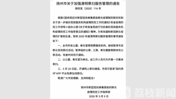 这份“通告”内容包括:扬州全市所有公墓、骨灰堂等殡葬服务机构,继续暂停市民群众现场祭扫活动;暂停组织公祭、江祭、骨灰撒散等群体性公祭活动。恢复时间另行通知。以公墓、骨灰堂为单位,由工作人员代为开展一次集体祭扫。3月20日起,开通网上祭扫通道。市民可以登录“我的扬州”APP平台免费在线祭扫。