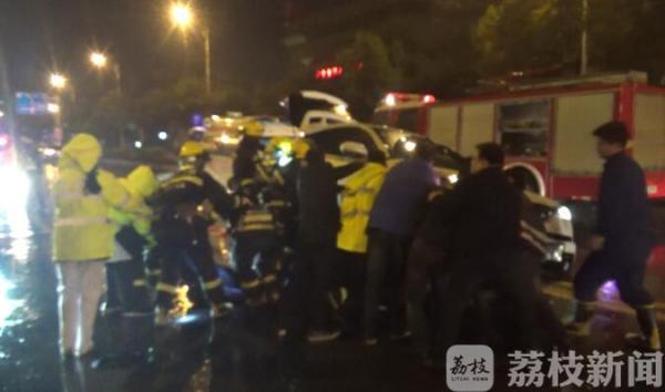 昨晚9点14分,镇江扬中市三茅街道文景楼附近路段发生一起交通事故,一名男子被压小轿车底。当时天空中下着雨,男子头部受伤严重,情况十分危急,已来不及调集吊车支援。现场消防队员立即决定用人力抬车的方式紧急救人。