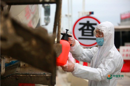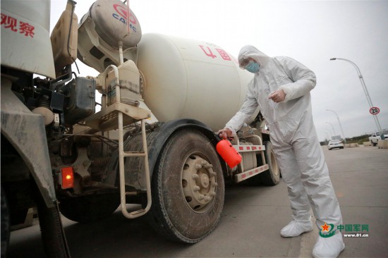 官兵对进出盐田港填海区的车辆进行防疫消毒