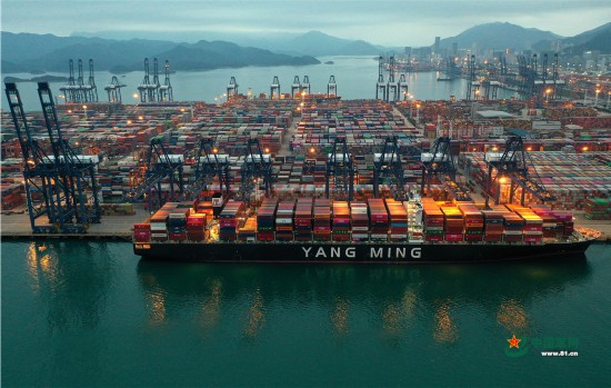 这是武警官兵守护的深圳盐田港,夜幕降临,码头上的灯陆续亮了起来(无人机航拍)