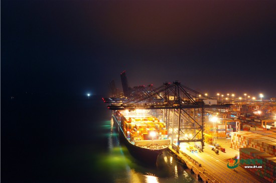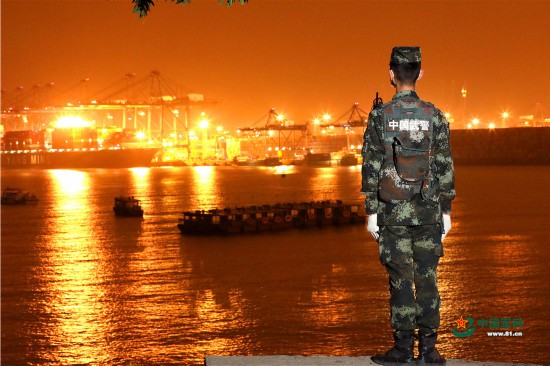 夜晚的深圳盐田港一派灯火通明景象,哨兵在默默守护