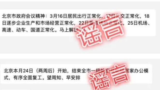 北京日报讯 近日,两条谣言在多个微信群和朋友圈流传。一条声称“北京市政府会议精神,3月16日居民出行正常化,17日公交正常化......”,还有一条称“北京本月24日(两周后)开始,结束全市一级响应及轮班居家办公模式,有序全面复工……”详情>>