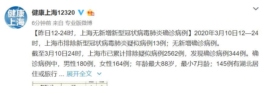 截至3月10日24时,上海市已累计排除疑似病例2562例,发现确诊病例344例。确诊病例中,男性180例,女性164例;年龄最大88岁,最小7月龄;145例有湖北居住或旅行史,34例有湖北以外地区居住或旅行史,159例有相关病例接触史,4例有伊朗居住史,2例有意大利居住史;外地来沪人员111例,境外输入人员6例,本市常住人口227例。具体情况如下图。