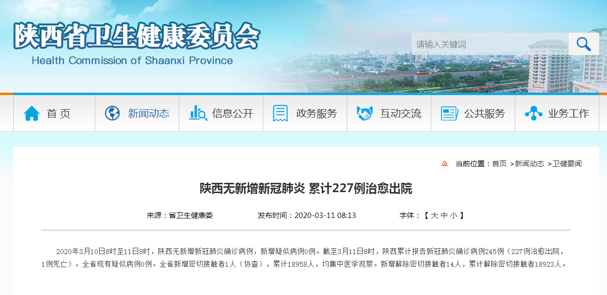 荔枝新闻讯 据陕西省卫健委官网消息 2020年3月10日8时至11日8时,陕西无新增新冠肺炎确诊病例,新增疑似病例0例。截至3月11日8时,陕西累计报告新冠肺炎确诊病例245例(227例治愈出院,1例死亡)。全省现有疑似病例0例。全省新增密切接触者1人(协查),累计18958人,均集中医学观察。新增解除密切接触者14人,累计解除密切接触者18923人。
