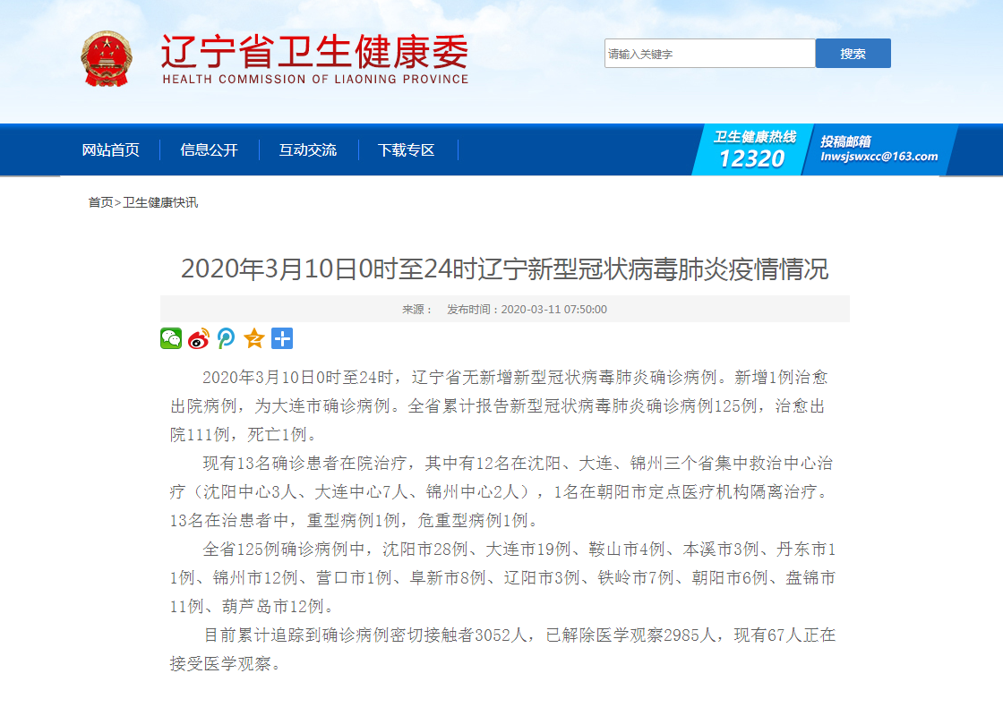 荔枝新闻讯 据辽宁省卫健委官网消息, 2020年3月10日0时至24时,辽宁省无新增新型冠状病毒肺炎确诊病例。新增1例治愈出院病例,为大连市确诊病例。全省累计报告新型冠状病毒肺炎确诊病例125例,治愈出院111例,死亡1例。