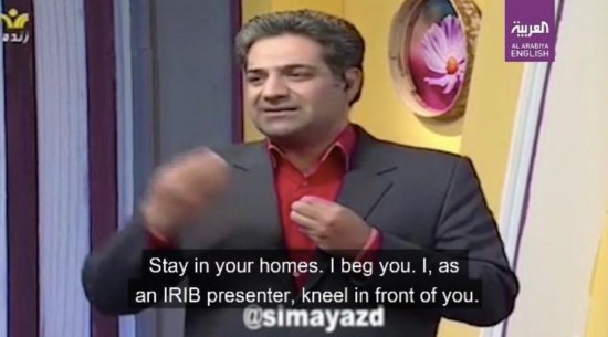 “3月5日,亚兹德省出现了7例新冠肺炎确诊病例,6日,又发现了57例。为什么会这样?人们这两天依然在室外活动。”这位主持人接下来双膝跪地,双手合十说道:“我跪下来,恳请你们待在家里。想想你们自己、家人和孩子。”