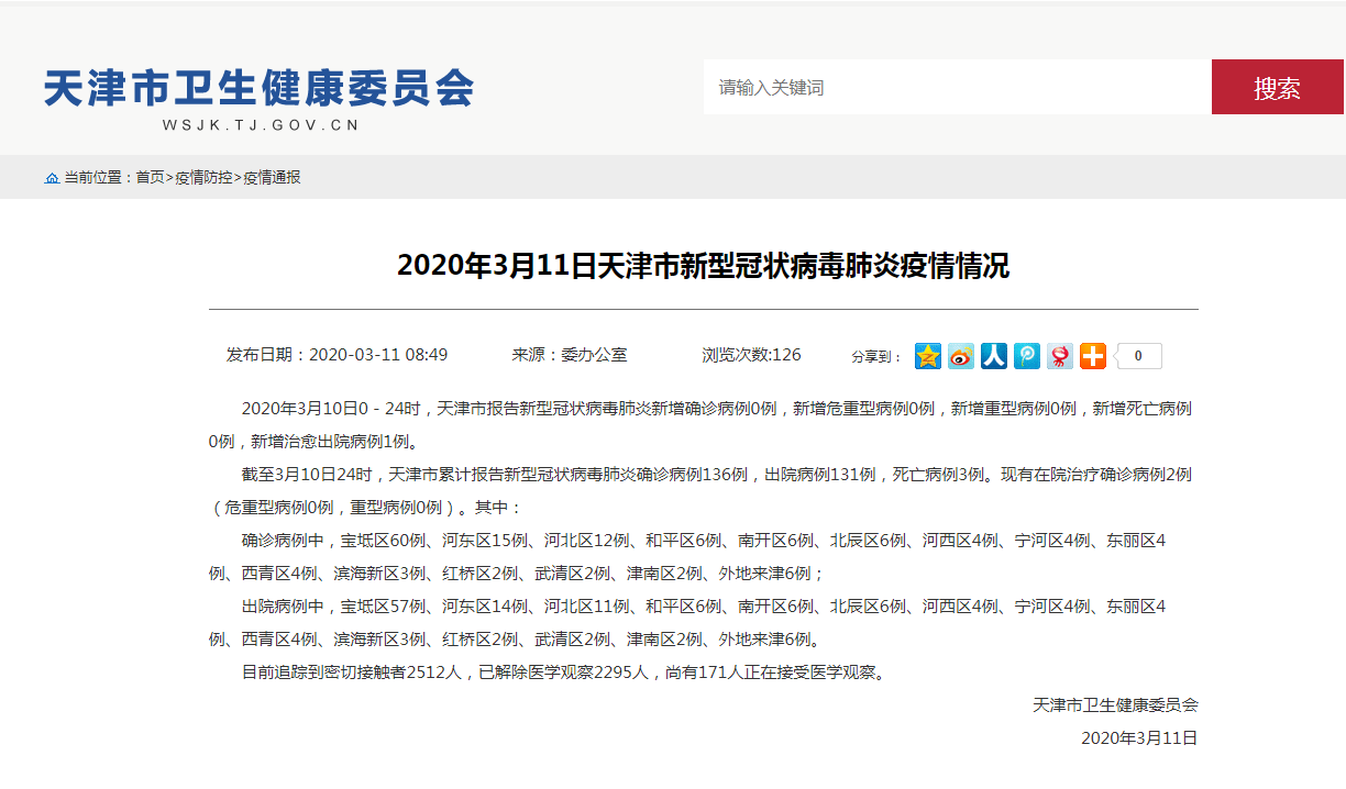 截至3月10日24时,天津市累计报告新型冠状病毒肺炎确诊病例136例,出院病例131例,死亡病例3例。现有在院治疗确诊病例2例(危重型病例0例,重型病例0例)。其中: