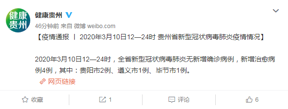 荔枝新闻讯 据贵州卫健委官微消息,2020年3月10日12—24时,全省新型冠状病毒肺炎无新增确诊病例,新增治愈病例4例,其中:贵阳市2例、遵义市1例、毕节市1例。