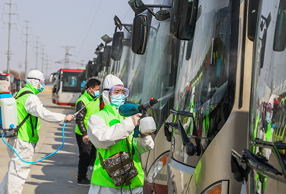 滕州市环保志愿者正在为客运车辆消毒。新华社 图 新华社济南