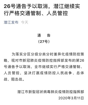 荔枝新闻讯 据“潜江发布”微信公众号消息,3月11日,潜江市新型冠状病毒肺炎疫情防控指挥部发布26号通告予以取消,潜江继续实行严格交通管制、人员管控。全文如下: