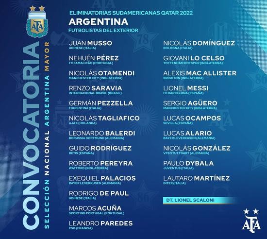 人民网北京3月11日电 北京时间3月10日晚,阿根廷国家队公布了3月份世预赛的备战大名单,这份名单中都是效力于海外的球员,梅西领衔,迪巴拉在列。3月27日,阿根廷将在主场迎战厄瓜多尔,3月31客场对阵玻利维亚。
