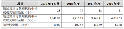 与此同时,招股说明书“招投标费用”中显示,对于公开招标项目,甲方可以直接委托政府采购中心或者第三方代理机构来完成项目的招标程序。如果甲方通过第三方代理机构来完成项目的招投标程序,需在项目成功中标以后,由中标方向其支付一笔中标服务费用;如通过政府采购中心完成项目的招投标程序,则无需向其支付相关中标服务费用。2016-2019年上半年,开普云通过第三方代理机构中标或成交的项目数量分别为51个、88个、79个和23个。