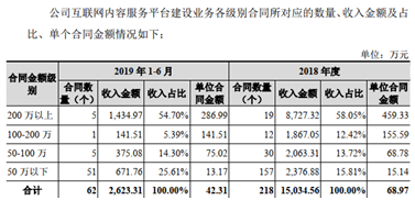 按照合同金额大小分类,2019年上半年,开普云的互联网内容服务平台建设业务的收入为2623.31万元,其中,合同数量及收入分布截图如下。