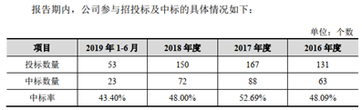 招股说明书显示,开普云的业务获取方式以公开招标方式为主,以商务谈判、竞争性谈判等其他方式为辅,其中,互联网内容服务平台建设业务获取以公开招标方式为主,大数据服务及运维服务业务获取则以商务谈判为主。2016-2019年上半年,开普云的中标数量分别为63个、88个、72个和23个。