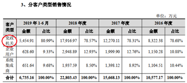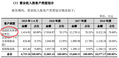 同时,2019年上半年100万元以上合同带来的收入金额为1576.48万元,其中,89.87%(即1416.78万元)来自党政机关及事业单位类客户,10.13%(即159.7万元)来自企业(不含系统集成商)类客户。