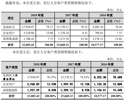 对此,开普云回复的更正之一就是“分客户类型销售情况”,更正的原因是因部分客户类型划分不够准确,导致发行人报告期内分客户类型销售情况披露有误。更正前后的对比截图如下。