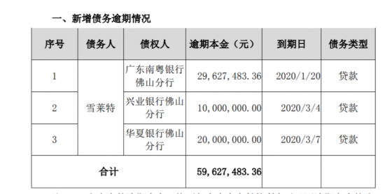 3月9日晚间,雪莱特就曾披露,公司因资金状况紧张出现部分债务逾期,经公司财务部门统计核实,截至2020年3月7日,雪莱特新增3笔债务逾期,新增债务逾期本金合计5962.75万元。
