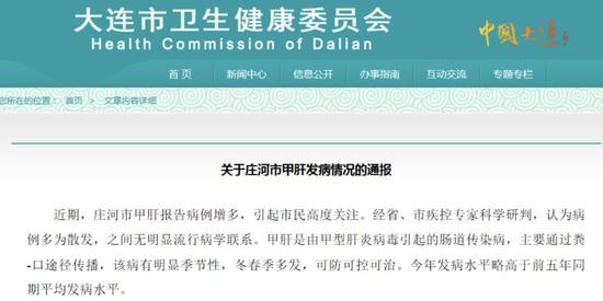 就在10日,大连市卫健委在其官网通报了庄河甲肝病例的最新情况,通报称,近期大连庄河市甲肝报告病例增多,经辽宁省、市疾控专家科学研判,认为病例多为散发,之间无明显流行病学联系。
