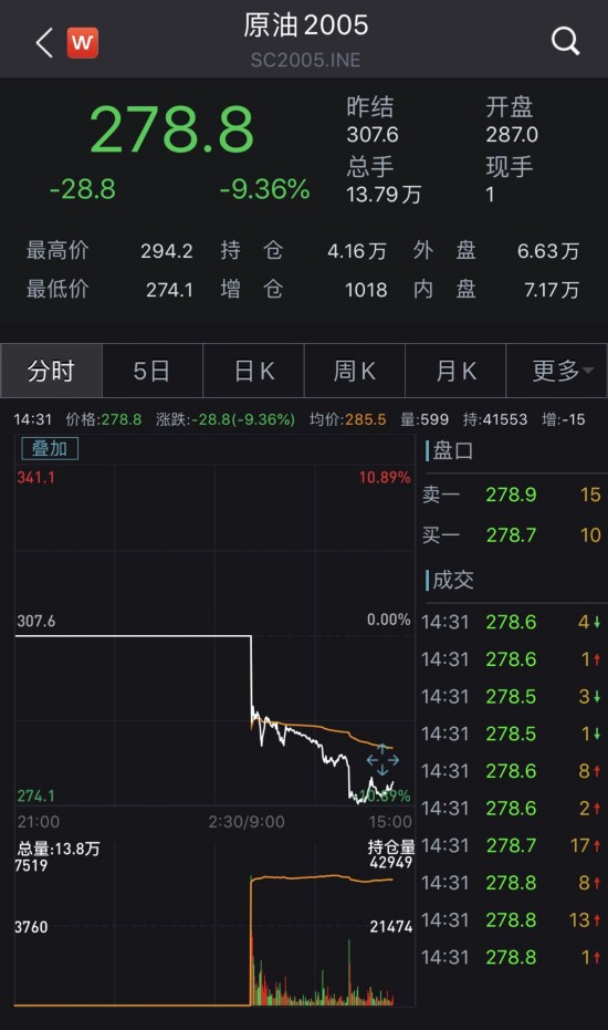 中新经纬客户端3月11日电 沙特与俄罗斯这场“石油价格战”扰动着全球。国内期货市场方面,上期所原油期货主力合约触及跌停,截至发稿,下跌幅度9.36%,报278.8元/桶。