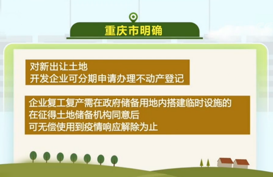 重庆市明确,对新出让土地开发企业可分期申请办理不动产登记;企业复工复产需在政府储备用地内搭建临时设施的,在征得土地储备机构同意后,可无偿使用到疫情响应解除为止。