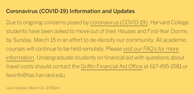 随后,消息再次更新。哈佛要求,本科生须在3月15日下午5:00之前搬离校园,并把所有东西打包带走。
