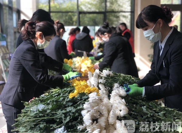上午八点多,公墓办事大厅一派忙碌景象。地上堆着早上运来的一万支菊花,公墓主任张志军正蹲在地上修剪花枝。旁边三张桌子围站着二十多位工作人员和滨湖区民政局党员志愿者,她们有的在摘除包裹花朵的塑料膜,有的拿彩纸包装菊花。