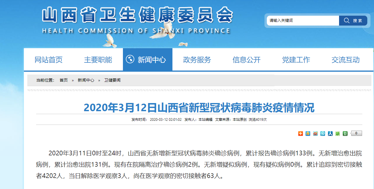 荔枝新闻讯 2020年3月11日0时至24时,山西省无新增新型冠状病毒肺炎确诊病例,累计报告确诊病例133例。无新增治愈出院病例,累计治愈出院131例。现有在院隔离治疗确诊病例2例。无新增疑似病例,现有疑似病例0例。累计追踪到密切接触者4202人,当日解除医学观察3人,尚在医学观察的密切接触者63人。
